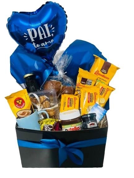 Caixa contendo : 1 caneca / 1 balão coração / 1 botão de rosa/ 1 nutella/ 1 bolo Bauduco / 1 suco Garibaldi/ 2 Polenguinho/ 1 mini geléia st dalfour/ 1 goiabinha / 1 chocoballs Bauduco/2 saches de torradas Bauduco/sachê de capuccino/50 gr petifour/1 sonho de valsa .