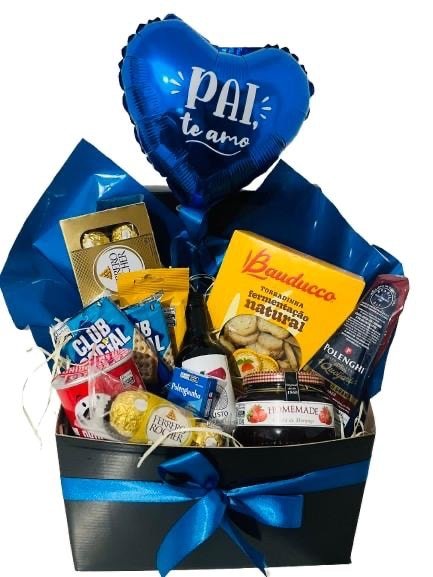 Caixa contendo : 1 Balão / 2 pct clube social / 1 lata batata pringles / 1 pct 3 bombons ferrero Rocher/1 pote geleia homemade/ 1 queijo polengui tipo grana / 1 cx torrada Bauduco / 1 garrafa de vinho Fausto Merlot 187 ml / 1 cx Ferrero Rocher c 8 und / 1 pct chocolate boll Bauduco .